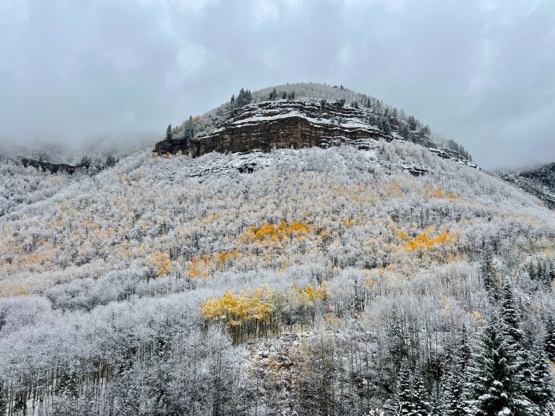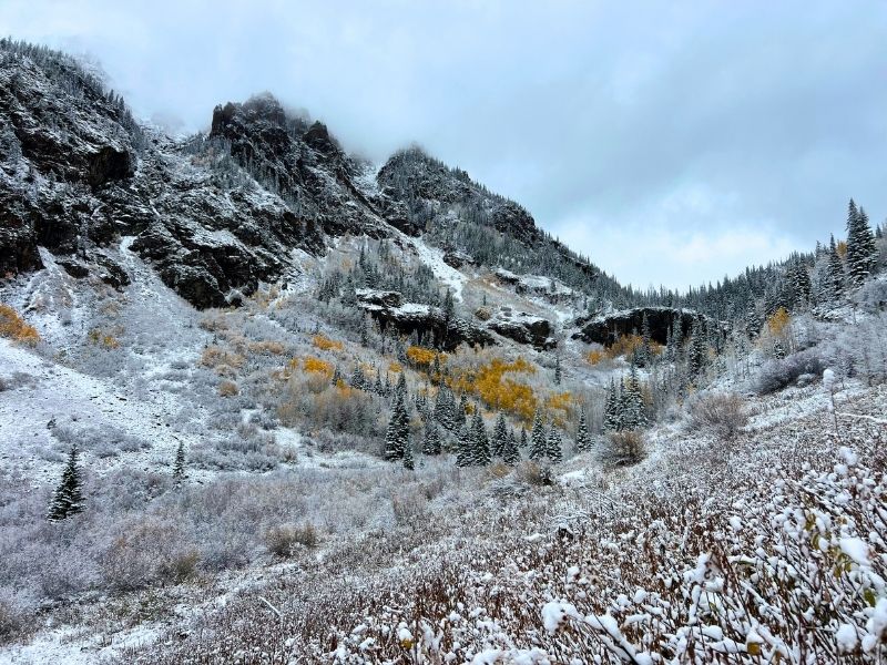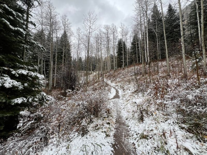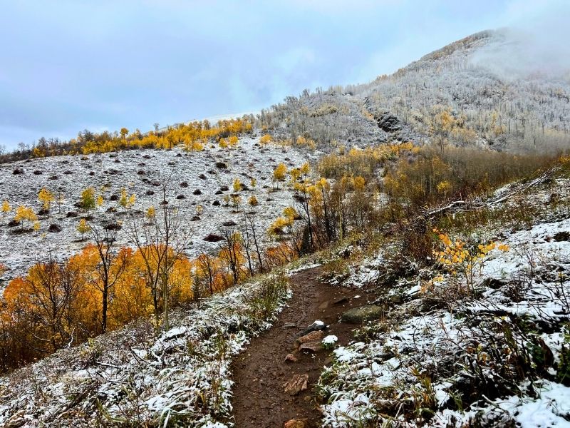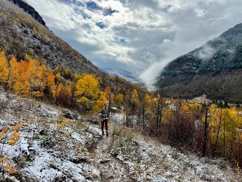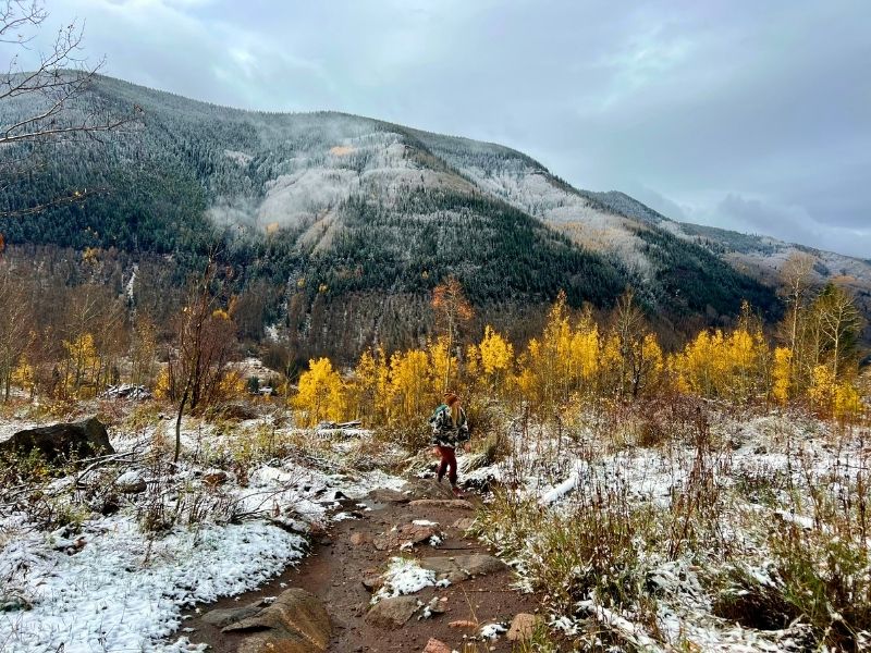 Less than a mile in, the trees start to open up, offering your first views of the Gore Range and the Vail Valley stretching below. From here, the trail gets just a little rockier and more exposed as you move toward the upper basin. When I hiked it, there was a light morning snowstorm which continued throughout our hike, and the landscape had this surreal mix of seasons — golden yellow aspens below and a dusting of snow blanketing the upper ridges and the dirt trail. It felt like hiking through two worlds colliding… and it was amazing!