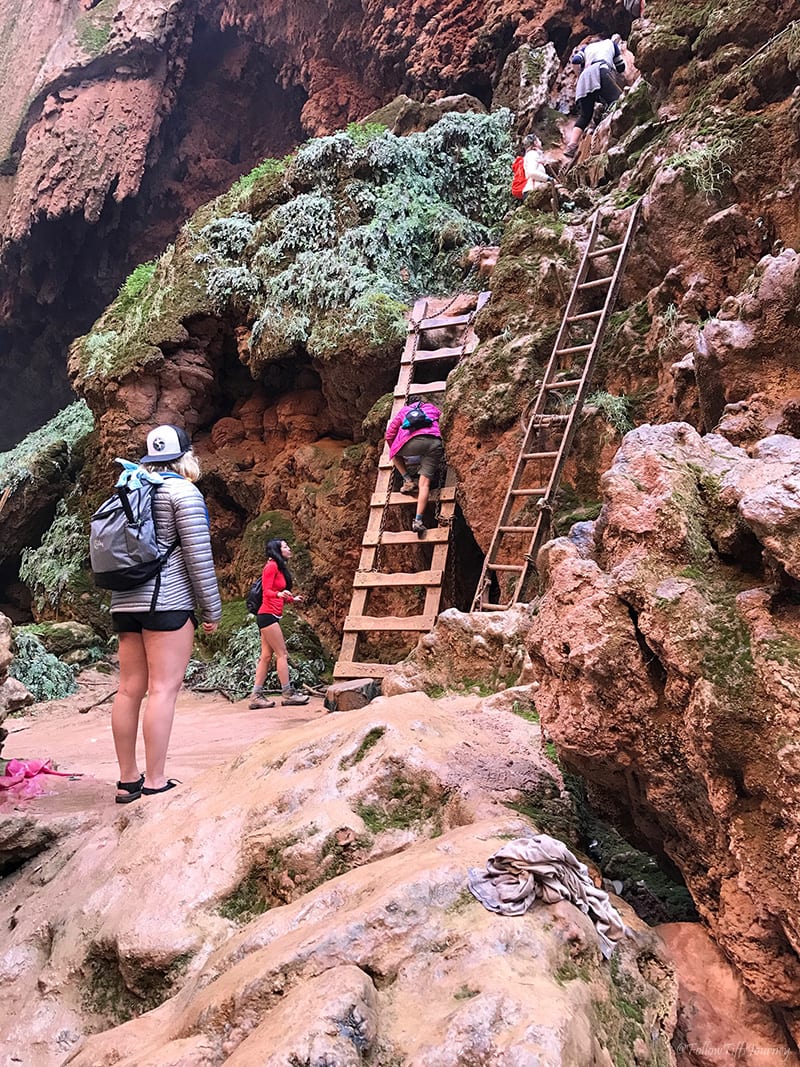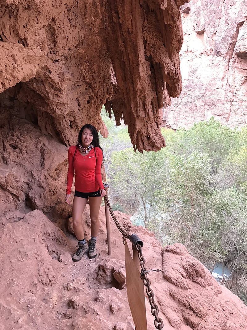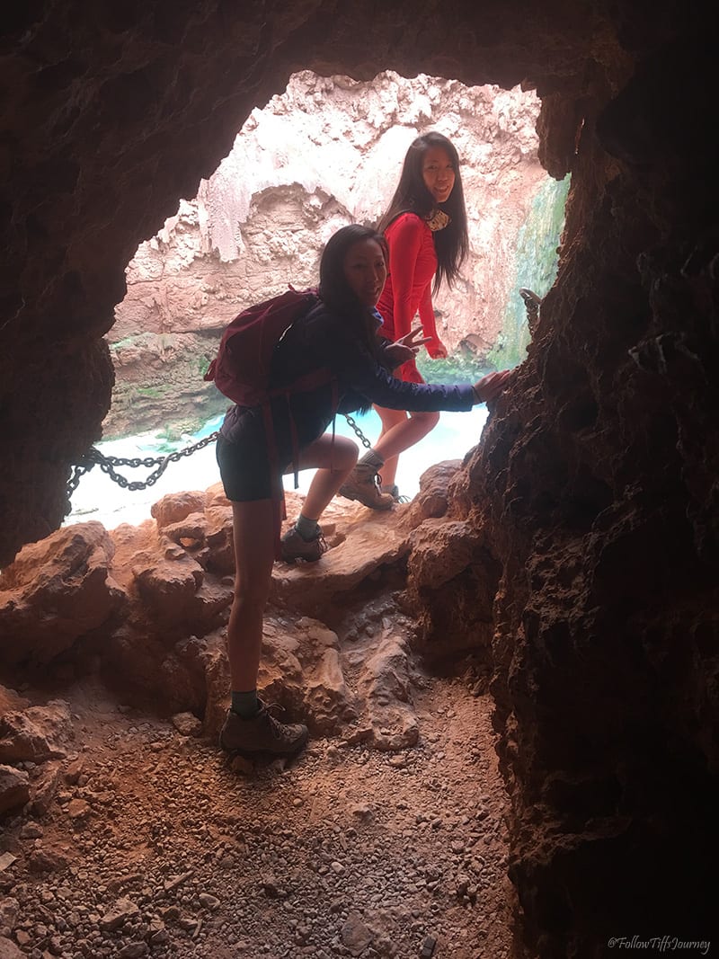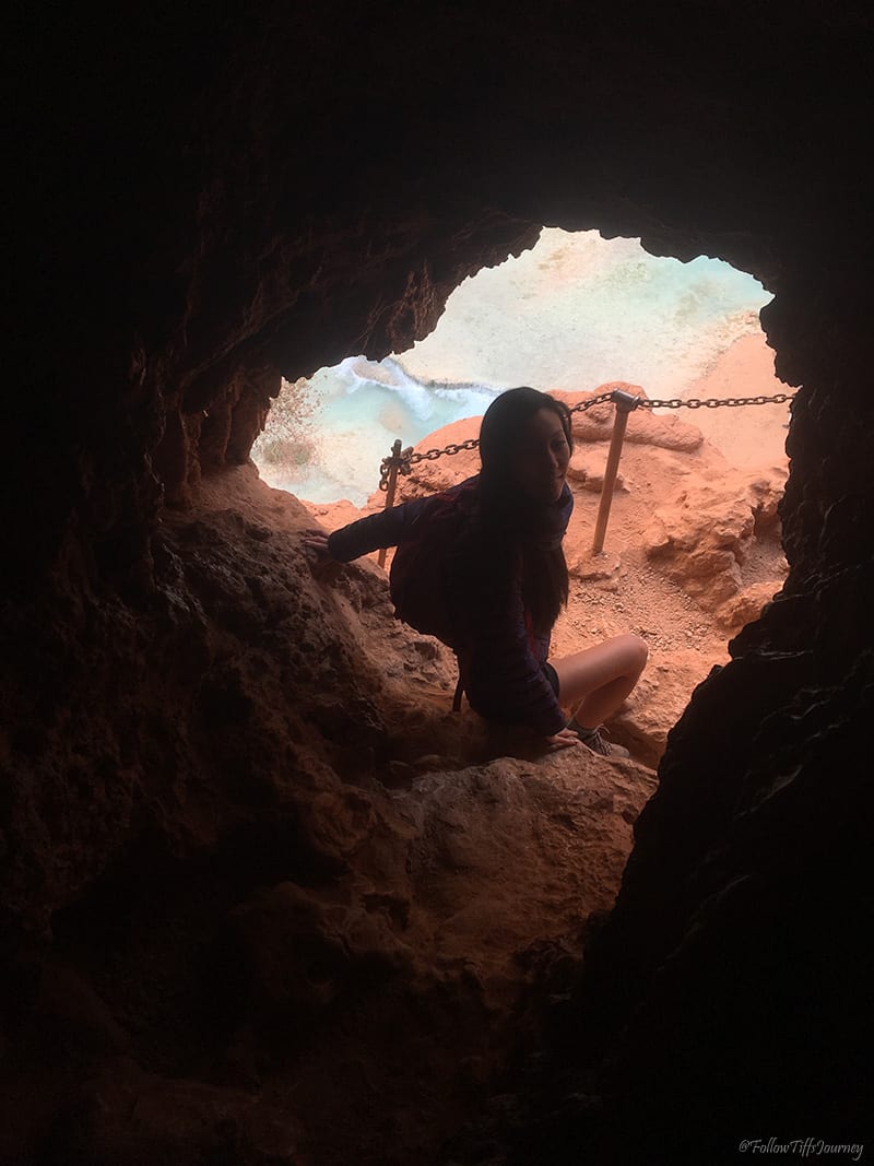 After relaxing a little bit (I only got 2 hours of sleep from the drive over), we started to make our way down to Mooney Falls at 2 pm. Β Let me tell you… I’m terrified of heights… I really am, so just looking at the trail down, I thought I may not go – don’t let that view scare you! It’s really not as bad as it first appears. It’s actually quite fun! Β It starts off like a normal downhill trail with steps (but steeper so be careful), then you reach some flat parts, then go through a narrow but short cave, and then you reach the more dangerous part. Β The chains are your best friend – hold on with a good grip because the trail does get slippery and wet from the falls (yes, you will be drizzled). There are three flights of ladders at the end that are trickier to maneuver. Β Just take your time because everyone else is on the same journey. Β 30 mins and a gazillion pictures later, we safely made it to the bottom of Mooney Falls.