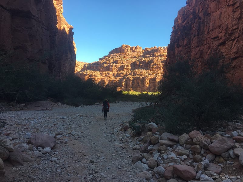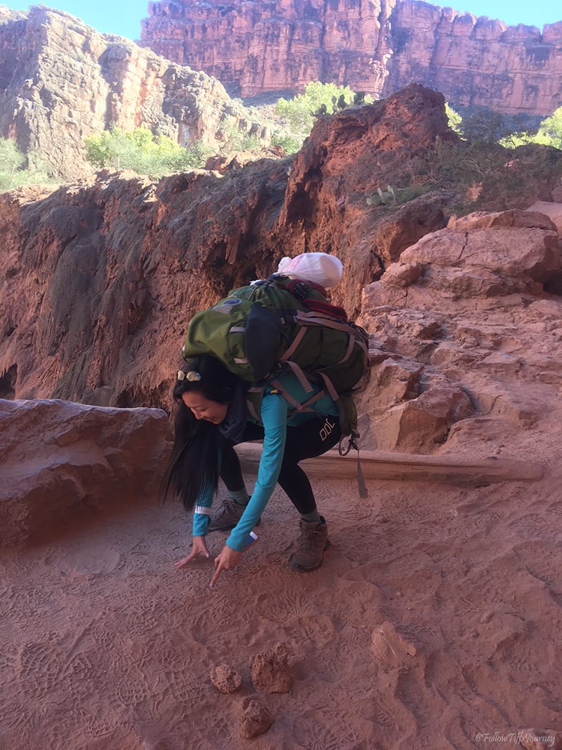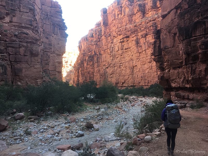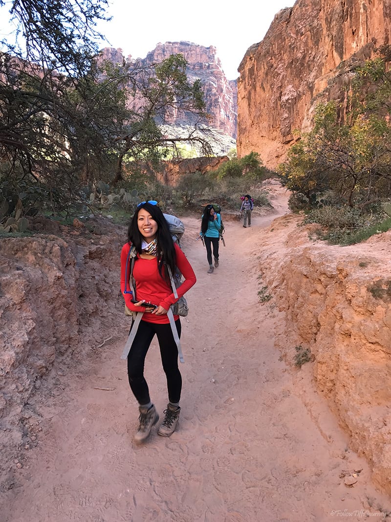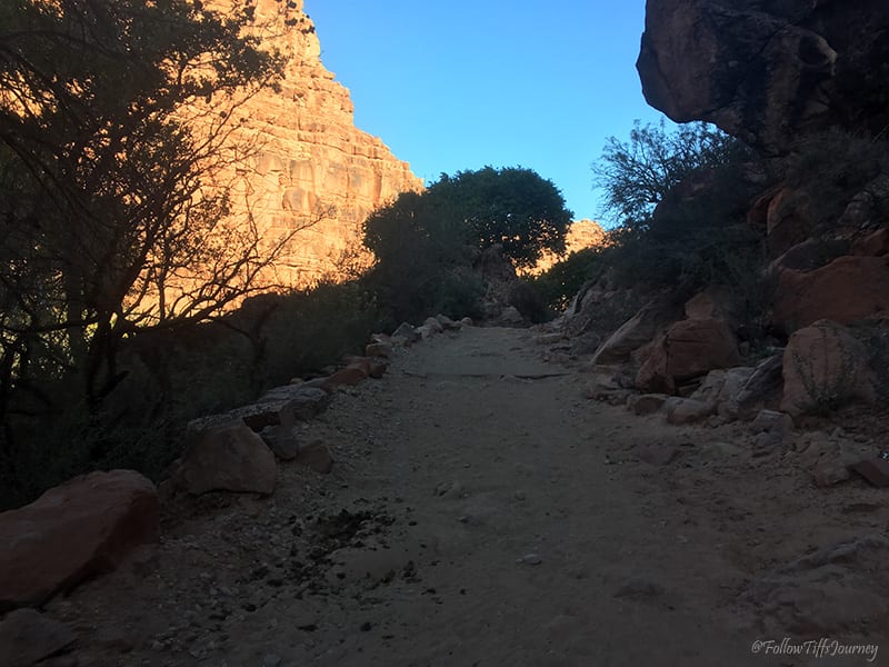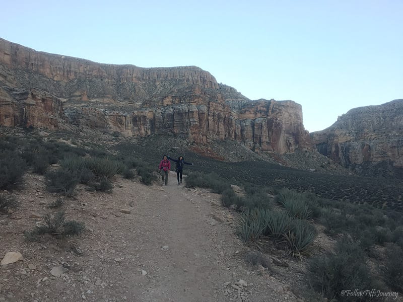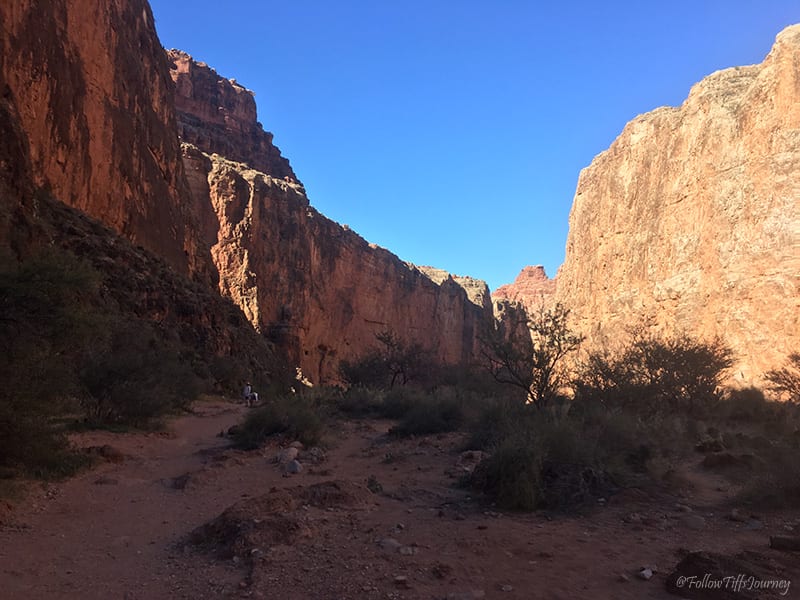 We arrived at 6:30 am (don’t forget about the 1 hr time difference from LA… cause we totally did) and started to hike by 7 am. The trail is well maintained and easy to follow; Β just watch out for the serious amount of horse poop on that first mile going down. Β Once you reach the canyon floors, you can basically walk in the middle of what I assume is a dried up river, or if you look along the sides (sometimes right side, sometimes left), you’ll often find the sandy trail that’s easier to walk on since there are not all the small rocks. Β The first few miles, if not all, are actually marked on the trail (but not if you are walking in the middle)… which we did not realize until coming back.