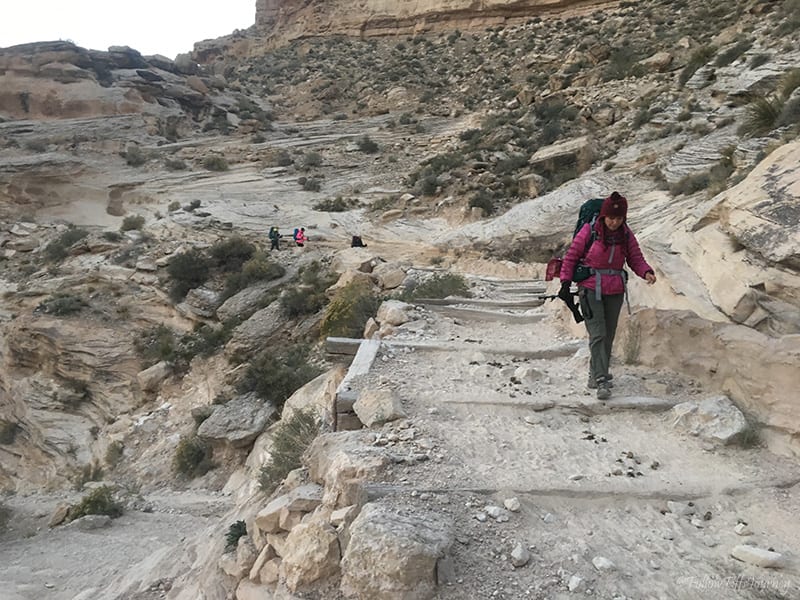 We started hiking out at 11:50 am and walked about 2 hours on the flat ground before reaching that incline at the end. Β We flew by all the other hikers on the ground simply because we didn’t have our heavy packs… best decision ever! Β The last mile was super slow and more of a struggle for the beginners of our group. Β We went slow and took our time and got back to the car at 2:30 pm. Our packs were up there waiting for us too!