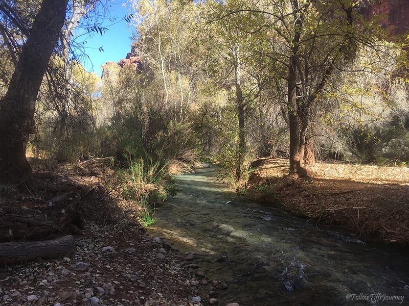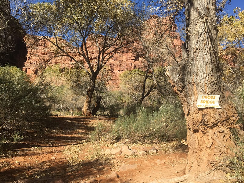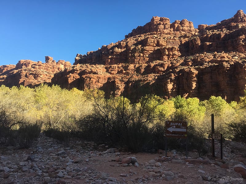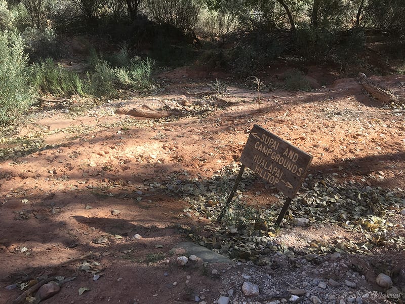 At 10 am, we reached the first sign for Supai and you are finally out of walking between the giant canyon walls. Β This was the time to put on the sunblock. Β Just a few minutes later, you see the flowing creek for the first time… and it’s just as pretty as you would imagine… but keep going, it’ll get better.