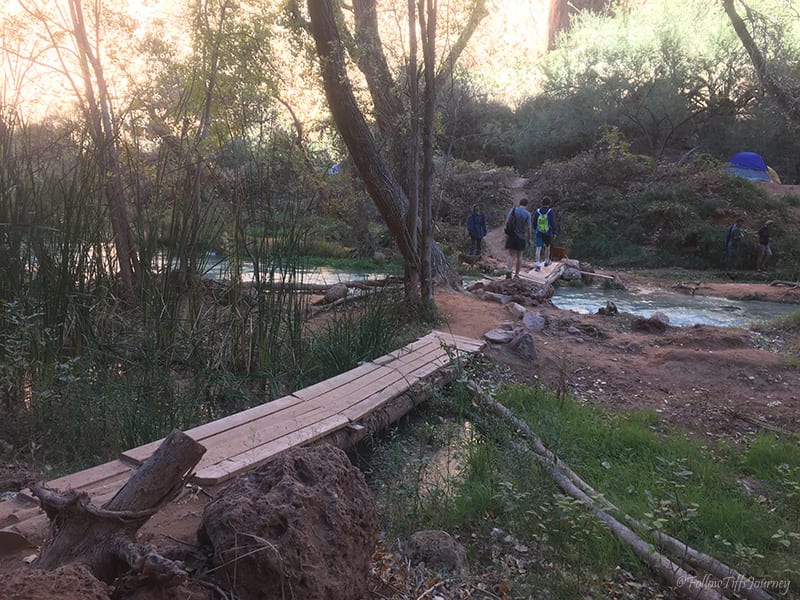 At 12:10 pm, we passed Navajo Falls. At 12:25 pm, we crossed the bridge over the creek, and at 12:29 pm, we arrived at Havasu Falls. Β We had to stop for a quick photo op but our plan was to stop by the next morning since we were only staying one night and wanted to use our daylight at Mooney Falls.